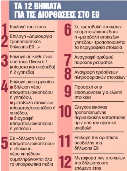 Οι ιδιοκτήτες ακινήτων οι οποίοι κατά τη διάρκεια του 2020 δήλωσαν στους δήμους τις «λειψές» επιφάνειες των ακινήτων τους που δεν είχαν αποτυπωθεί ούτε στο Ε9 ή τακτοποίησαν αυθαίρετους ή ημιυπαίθριους χώρους έχουν προθεσμία μέχρι τις 31 Μαΐου 2021 να υποβάλουν δήλωση στοιχείων ακινήτων (έντυπο Ε9) και να εμφανίσουν στον λογαριασμό τους στο Taxisnet την πραγματική εικόνα της ακίνητης περιουσίας τους.