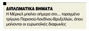 «H νέα καγκελάριος, 51, ετών, κάνει σήμερα τα πρώα διπλωματικά βήματά της στο ταραγμένο τρίγωνο Παρισιού – Λονδίνου – Βρυξελλών, όπου μαίνονται οι διαφωνίες για τον ευρωπαϊκό προϋπολογισμό, την αγροτική πολιτική και τις αρμοδιότητες της Ευρωπαϊκής Επιτροπής.