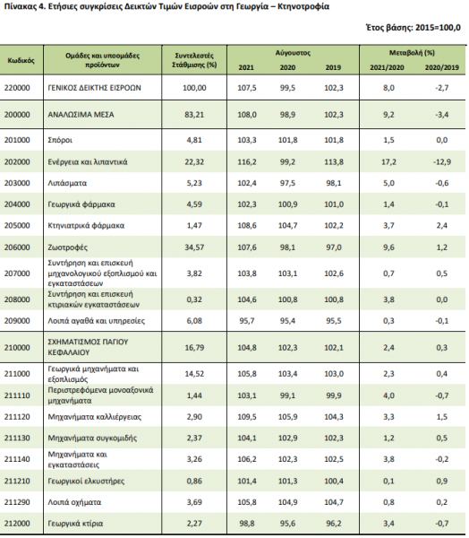 Η αύξηση του Γενικού Δείκτη Τιμών Εισροών κατά 8,0%, τον μήνα Αύγουστο 2021, σε σύγκριση με τον αντίστοιχο δείκτη του Αυγούστου 2020, οφείλεται στην αύξηση κατά 9,2% του δείκτη τιμών των αναλώσιμων μέσων και κυρίως στη μεταβολή των ομάδων ενέργεια και λιπαντικά, και ζωοτροφές.
