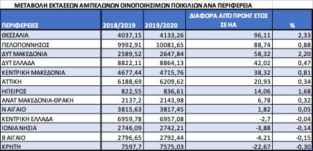 Αντίθετα αρνητική πρωτιά στη μείωση εκτάσεων κατέχει η περιφέρεια της Κρήτης, στην οποία παρατηρείται παρά τη χορήγηση Αδειών Φύτευσης, υποχώρηση των φυτεμένων εκτάσεων το 2019/2020 κατά 226,7 στρέμματα.