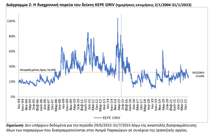 Ο δείκτης τεκμαρτής μεταβλητότητας KEPE GRIV ή δείκτης «φόβου» αποτυπώνει την αβεβαιότητα των συμμετεχόντων στην αγορά παραγώγων για την αναμενόμενη βραχυπρόθεσμη πορεία της ελληνικής αγοράς και υπολογίζεται στη βάση των τιμών των δικαιωμάτων προαίρεσης του δείκτη FTSE/X.A. Large Cap. Η τιμή του δείκτη KEPE GRIV μειώθηκε τον Ιανουάριο του 2023 φτάνοντας το 27,62% στις 31/1/2023 από 28,48% στις 30/12/2022 (Βλ. Διάγραμμα 2). Ο δείκτης παρέμεινε σε επίπεδα χαμηλότερα του ιστορικού μέσου όρου του (από τον Ιανουάριο του 2004) για την ελληνική αγορά, ο οποίος είναι στο 32,56%. Επιπλέον, η μέση ημερήσια τιμή του δείκτη μειώθηκε, φτάνοντας το 27,08% τον Ιανουάριο του 2023 από 29,77% τον Δεκέμβριο του 2022. Η εξέλιξη του δείκτη αποτυπώνει μείωση της αβεβαιότητας για την αναμενόμενη βραχυπρόθεσμη πορεία της ελληνικής αγοράς σε σχέση με τα τέλη του προηγούμενου μήνα.