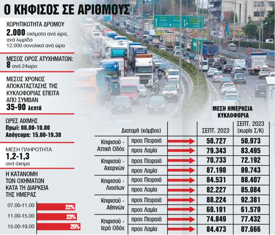 Σύμφωνα με τα στοιχεία του Κέντρου Διαχείρισης και Μελετών Κυκλοφορίας της Περιφέρειας Αττικής, τον Σεπτέμβριο η Μέση Ημερήσια Κυκλοφορία (ΜΗΚ) στον κόμβο Λεωφόρου Κηφισού – Λιοσίων έφτασε τα 166.758 αυτοκίνητα και στα δύο ρεύματα.