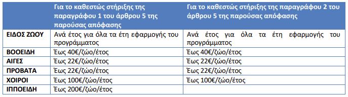Με βάση τα παραπάνω κριτήρια η αρμόδια επιτροπή καθορίζει το ύψος των επιλέξιμων δαπανών, με ανώτατο όριο το μέσο κόστος ανά ζώο ανά έτος και τριετία σύμφωνα με τον παρακάτω πίνακα: