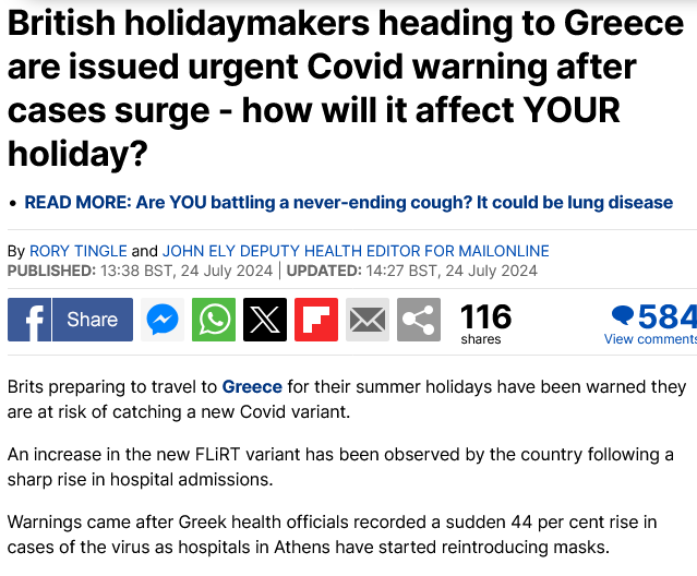 Οι εφημερίδες «Express» και «Mirror» κάνουν λόγο για «επείγουσα προειδοποίηση» προς τους Βρετανούς τουρίστες μετά από κρούσματα και θανάτους στην Ελλάδα από την παραλλαγή FLiRT του κορονοϊού.