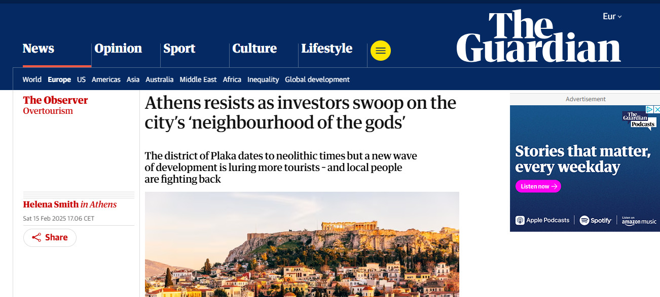 Αφιέρωμα στην Πλάκα, τη «γειτονιά των θεών» και την αβίωτη κατάσταση για τους κατοίκους της λόγω του υπερτουρισμού, φιλοξενεί ο «Observer» και δημοσιεύει ο «Guardian».
