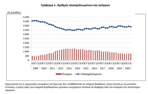 Σύμφωνα με τα στοιχεία της ΕΛΣΤΑΤ, «ο αριθμός των απασχολουμένων ανήλθε σε 3.878.454 άτομα. Το ποσοστό απασχόλησης μειώθηκε κατά 1,2%, σε σχέση με το προηγούμενο τρίμηνο και κατά 0,6%, σε σχέση με το αντίστοιχο τρίμηνο του προηγούμενου έτους.