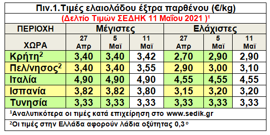 Στην Ισπανία για τα έξτρα παρθένα οι μέγιστες τιμές έφτασαν στα 3,80 €/kg ενώ οι ελάχιστες βρίσκονται στα 3,20 €/kg.
