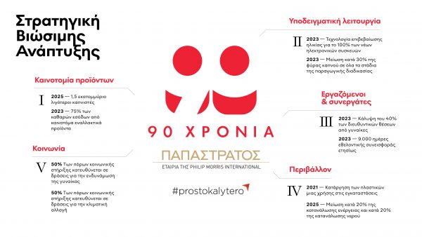 Η Στρατηγική της Παπαστράτος για Βιώσιμη Ανάπτυξη βασίζεται σε 5 πυλώνες και σαφείς, μετρήσιμους στόχους με συγκεκριμένο χρονοδιάγραμμα επίτευξης. Συγκεκριμένα, η εταιρεία ανακοίνωσε: