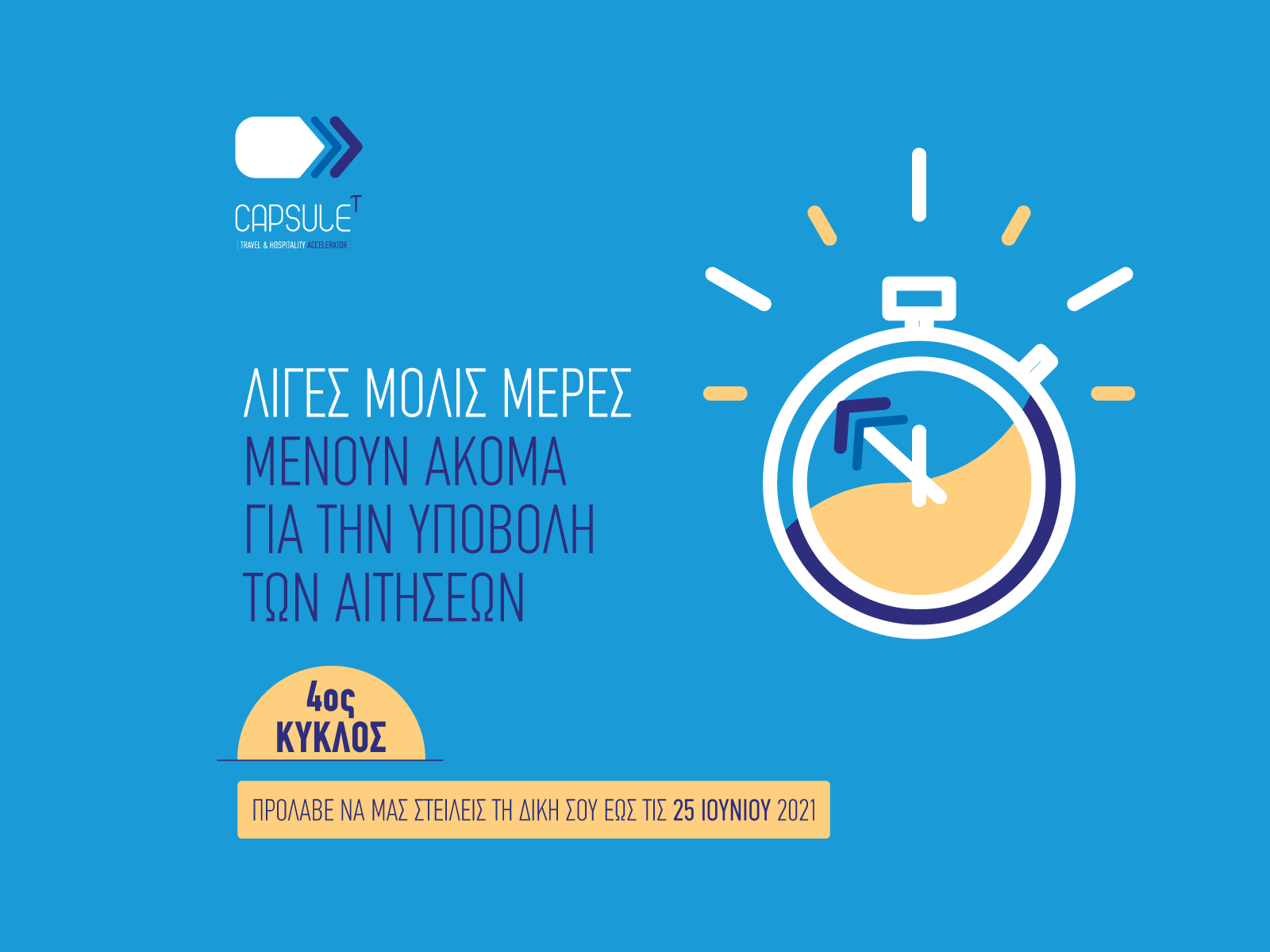 Ολοκληρώνεται η υποβολή αιτήσεων του 4ου κύκλου του Προγράμματος Επιτάχυνσης (Σεπτέμβριος 2021 – Φεβρουάριος 2022) του CapsuleT Travel & Hospitality Accelerator –του επιταχυντή που έχει δημιουργήσει το Ξενοδοχειακό Επιμελητήριο Ελλάδος– που έρχεται για να βοηθήσει νεοφυείς επιχειρήσεις με εφαρμογές τεχνολογίας στον τουρισμό να εξελίξουν τις υπηρεσίες τους και να λάβουν την απαραίτητη υποστήριξη που χρειάζονται σήμερα, περισσότερο από ποτέ.