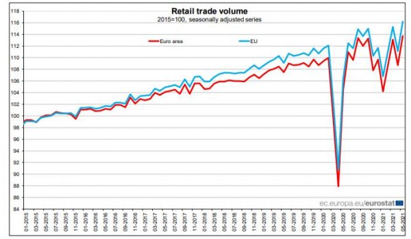 Στη ζώνη του ευρώ τον Μάιο του 2021, σε σύγκριση με τον Απρίλιο του 2021, ο όγκος του λιανικού εμπορίου αυξήθηκε κατά 8,8% για τα προϊόντα εκτός τροφίμων και κατά 8,1% για καύσιμα αυτοκινήτων, ενώ μειώθηκε κατά 0,2% για τρόφιμα, ποτά και καπνό.