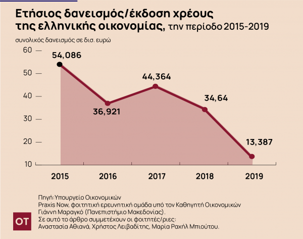 Το 2019 σημειώθηκε τελικά, έπειτα από αρκετά χρόνια, μια σημαντική μείωση στην έκδοση νέου χρέους, καθώς ο δανεισμός ανήλθε στα € 13.387 δις., με τη μεσοσταθμική διάρκεια του να φτάνει τα 4,05 έτη. Οι εισροές αυτές προήλθαν κατά κύριο λόγο, από εκδόσεις ομολόγων της Εθνικής Τράπεζας. Αξίζει να αναφερθεί, ότι εκείνη την χρονιά η χώρα προέβη στην έκδοση 10ετούς ομολόγου για πρώτη φορά από το 2010, ακόμα μια εν δυνάμει θετική εξέλιξη όσον αφορά την σταδιακή ανάκαμψη της οικονομίας. Ωστόσο, η διόγκωση των δημοσιονομικών κενών του 2020 και η αναπόφευκτη, επιτακτική ανάγκη για εισροή βοήθειας, έθεσαν εκ νέου εμπόδια σε αυτή την σχετική πρόοδο.