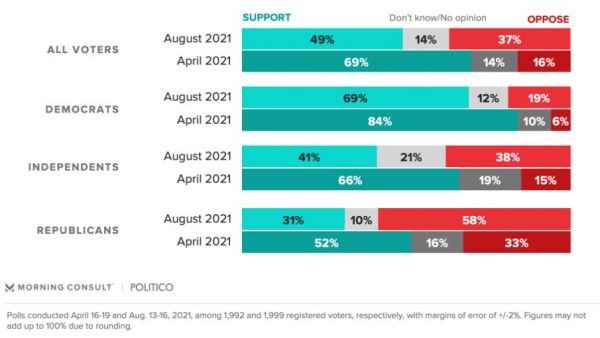 Μεταξύ των Δημοκρατικών ψηφοφόρων, το 53% εγκρίνει τη διαχείριση της αποχώρησης από το Αφγανιστάν από τον Τζο Μπάιντεν, ένα πολύ μικρότερο ποσοστό σε σύγκριση με εκείνο της δημοτικότητάς του στους κόλπους του κόμματος, «η οποία κυμαίνεται συνήθως μεταξύ 70-89%», σημειώνουν τα Politico και Morning Consult.