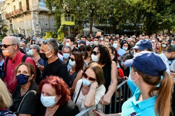 Με ένα λουλούδι στο χέρι, συνήθως κόκκινο τριαντάφυλλο ή γαρύφαλλο, και τηρώντας όλα τα μέτρα κατά του κορωνοϊού, άνθρωποι όλων των ηλικιών παρέμεναν ήσυχοι έως ότου έρθει η σειρά τους για να αποχαιρετίσουν τον μεγάλο δημιουργό.