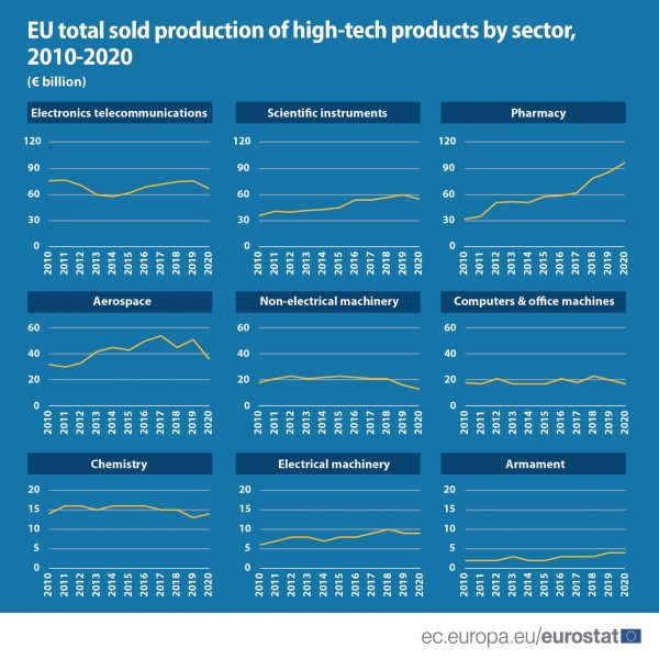 Σύμφωνα με την Eurostat, μεταξύ των προϊόντων υψηλής τεχνολογίας που πωλήθηκαν από χώρες της ΕΕ το 2020, ο κλάδος των φαρμακείων πήρε τη μερίδα του λέοντος, με τη συνολική πωλούμενη παραγωγή να διαμορφώνεται σε 97 δισεκατομμύρια ευρώ.