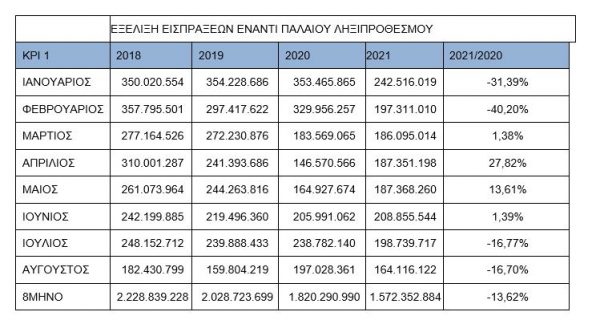 Σε ό,τι αφορά τις εισπράξεις 8μηνου, (εξαιρουμένων των μη φορολογικών κατηγοριών), αυτές έφτασαν τα 1.053 εκατ. ευρώ το τρέχον έτος, ενώ την αντίστοιχη περίοδο του 2020 ανήλθαν στα 735 εκατ. ευρώ, δηλαδή αυξήθηκαν κατά 46 εκατ. ευρώ. Σε ό,τι αφορά τις εισπράξεις έναντι νέου ληξιπροθέσμου για τον Αύγουστο του 2021 (εξαιρουμένων των μη φορολογικών κατηγοριών), έφτασαν τα 129 εκατ. ευρώ έναντι 103 εκατ. ευρώ την αντίστοιχη περίοδο του 2020, δηλαδή αυξήθηκαν κατά 25,25%.