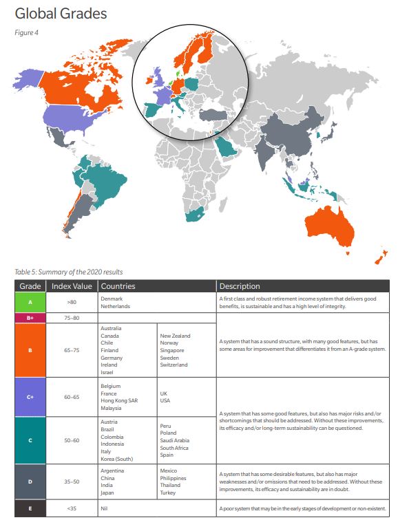 Οι βαθμολογίες 11 χωρών, συμπεριλαμβανομένης της Ινδίας και της Ν . Κορέας, υποχώρησαν φέτος, καθώς οι χώρες δίνουν μάχη για να περιορίσουν τις οικονομικές συνέπειες από την κρίση της Covid-19. Το τρέχον οικονομικό περιβάλλον που χαρακτηρίζεται από την περιορισμένη αύξησης στους μισθούς, τα ιστορικά χαμηλά επιτόκια και τις συρρικνωμένες αποδόσεις σε πολλές κατηγορίες περιουσιακών στοιχείων, ασκεί πρόσθετες οικονομικές πιέσεις στα υπάρχοντα συνταξιοδοτικά συστήματα, αναφέρει η έκθεση.