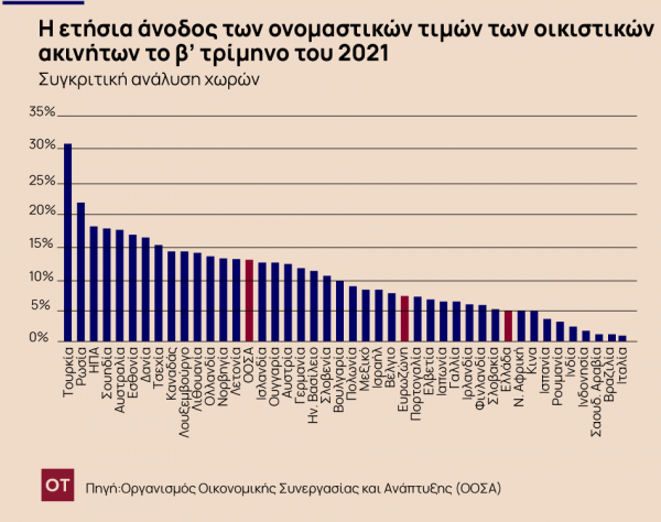 Ακόμα πιο έντονη ήταν η άνοδος των ονομαστικών τιμών των κατοικιών στις χώρες του ΟΟΣΑ (12,3%, κατά μέσο όρο, σε ετήσια βάση), ενώ οι μεγαλύτερες αυξήσεις, σύμφωνα με τα στοιχεία του ίδιου Οργανισμού, σημειώθηκαν στην Τουρκία (30,2%), στη Ρωσία (21,1%) και τις ΗΠΑ (17,4%).