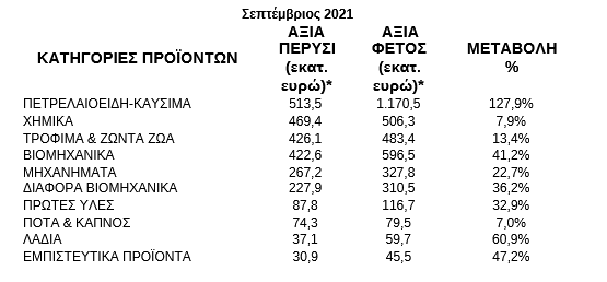Ωστόσο, πολύ μεγάλη άνοδος καταγράφεται και στις εισαγωγές τον Σεπτέμβριο του 2021 καθώς αυξήθηκαν κατά 1,57 δισ. ευρώ ή κατά 37,2% και ανήλθαν σε 5,81 δισ. ευρώ έναντι 4,23 δισ. ευρώ κατά τον ίδιο μήνα του έτους 2020. Εξαιρουμένων των πετρελαιοειδών, οι εισαγωγές αγαθών ανήλθαν στα 4,33 δισ. ευρώ από 3,67 δισ. ευρώ, δηλαδή αυξήθηκαν κατά 658,2 εκατ. ευρώ ή κατά 17,9%.