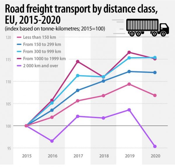 Τα περιοριστικά μέτρα επηρέασαν επίσης τις εμπορευματικές μεταφορές και σε επίπεδο αποστάσεων. Τα tkm που πραγματοποιούνται σε αποστάσεις 2.000 km ή περισσότερο μειώθηκαν κατακόρυφα το 2020 (-8% σε σύγκριση με το 2019). Καταγράφτηκαν, επίσης, μειώσεις στις κατηγορίες αποστάσεων λιγότερο από 150 km (-2%) και από 1.000 έως 1.999 km (-1%). Οι υπόλοιπες κατηγορίες αποστάσεων κατέγραψαν μικρές αλλαγές.