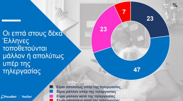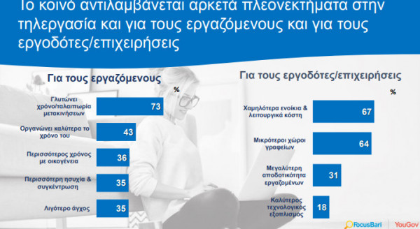Η πλειονότητα του κοινού δηλώνει υπέρ της τηλεργασίας με προϋπόθεση ότι η φύση του επαγγέλματος το επιτρέπει, και θεωρεί ότι είναι κάτι που χρειάζεται να συναποφασίζεται μεταξύ εργαζομένων και εργοδοτών, ώστε η λύση της τηλεργασίας να είναι αμοιβαίας ωφέλειας.