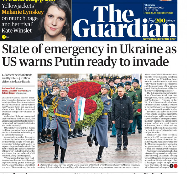 «Κατάσταση έκτακτης ανάγκης στην Ουκρανία – Οι ΗΠΑ επιμένουν ότι ο Πούτιν ετοιμάζεται να εισβάλλει» αναφέρει ο Guardian.