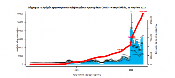 Ο ΕΟΔΥ ανακοίνωσε 23.106 κρούσματα σήμερα, Τετάρτη 23 Μαρτίου, καθώς και 53 θανάτους το τελευταίο 24ωρο σύμφωνα με την τελευταία ενημέρωση για τον κορωνοϊό στην Ελλάδα.