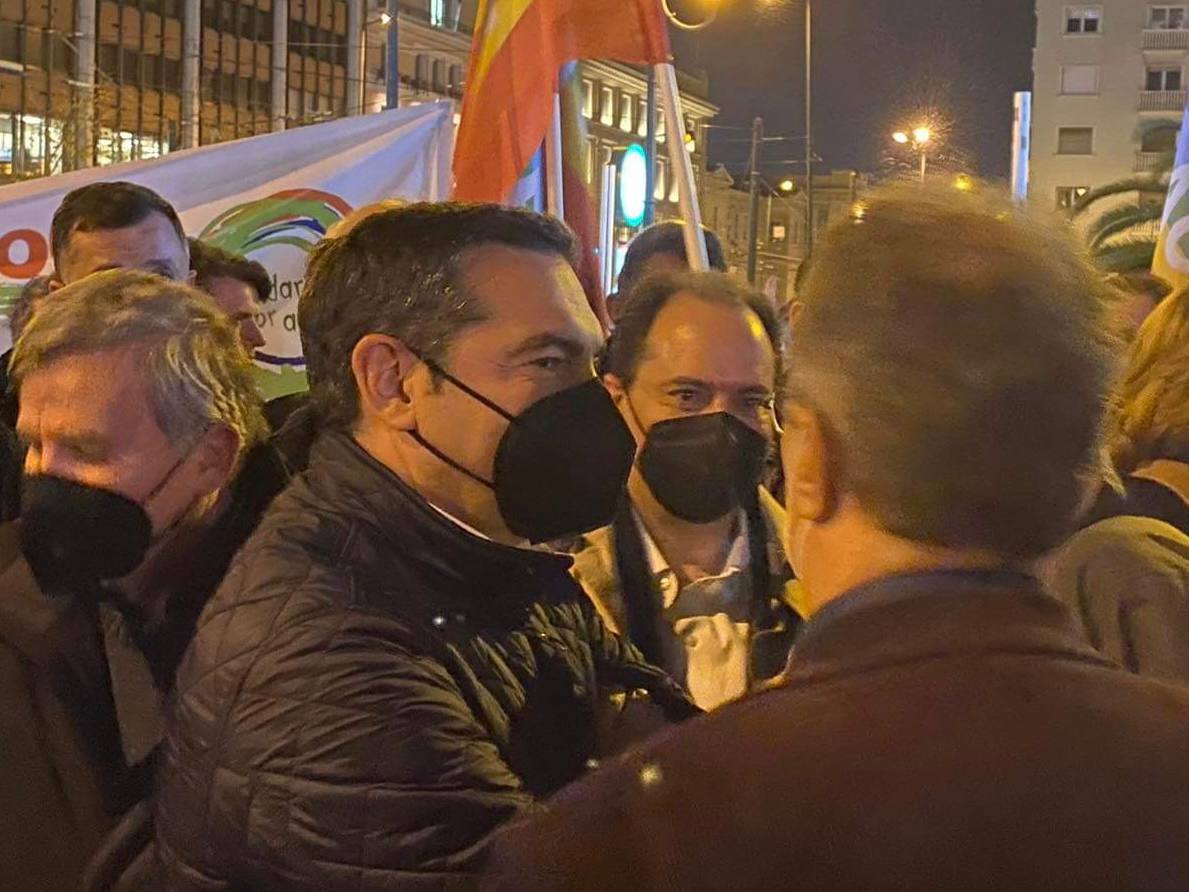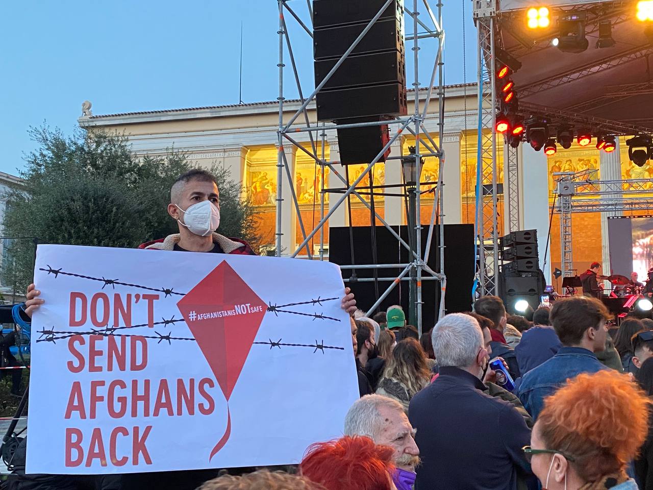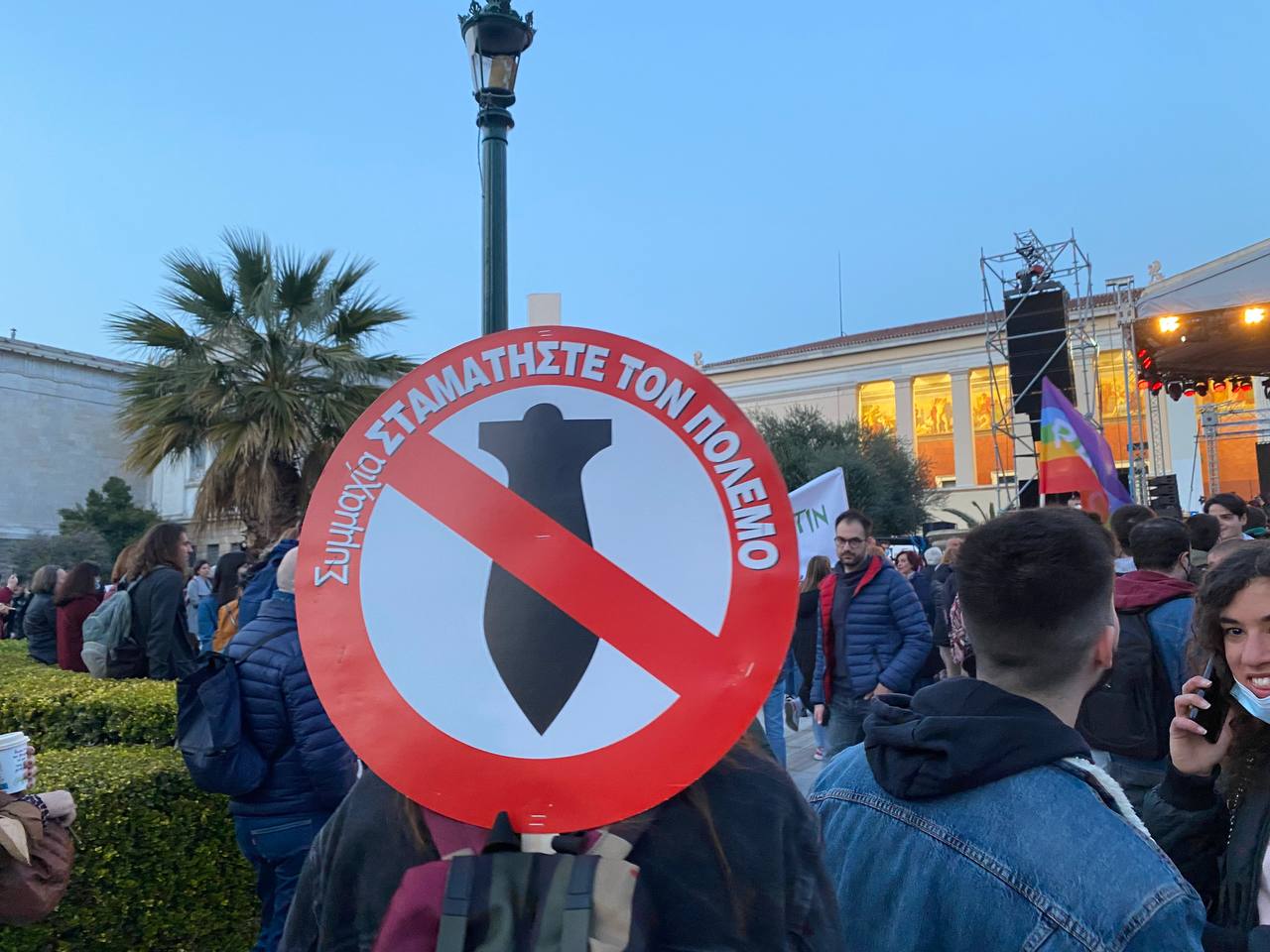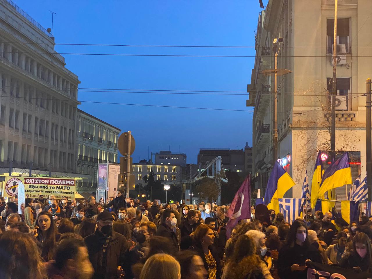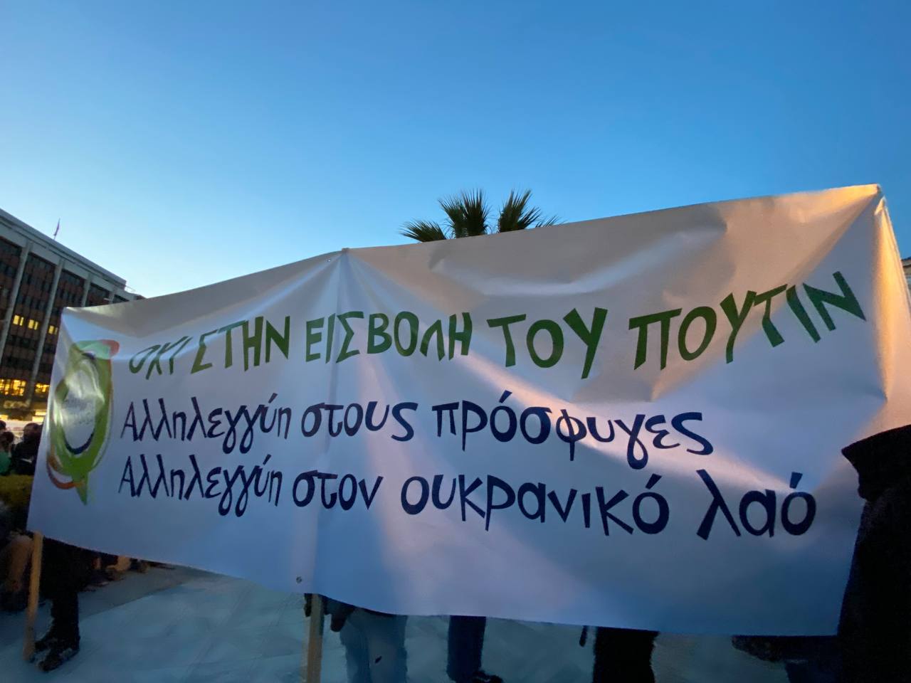 «Όχι στην εισβολή του Πούτιν. Αλληλεγγύη στους πρόσφυγες, αλληλεγγύη στον ουκρανικό λαό» γράφει ένα από τα πανό που κρατούν οι συγκεντρωμένοι πολίτες στο σημείο.