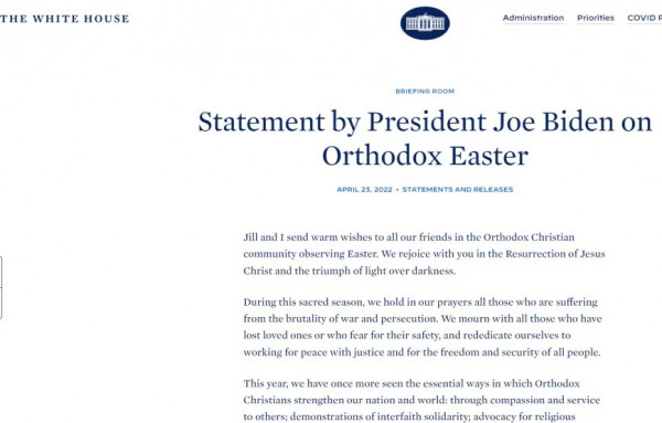 Τις ευχές τους για το Πάσχα της Ορθόδοξης Χριστιανικής Κοινότητας εκφράζει ο Πρόεδρος των ΗΠΑ Τζο Μπάιντεν μαζί με τη σύζυγό του Τζιλ σε γραπτή ανακοίνωση.