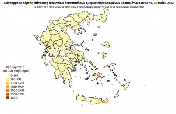 Ο χάρτης αποτυπώνει τη γεωγραφική κατανομή των κρουσμάτων COVID-19 των τελευταίων 14 ημερών ανά Περιφερειακή Ενότητα της χώρας, με βάση την δηλωθείσα διεύθυνση μόνιμης κατοικίας του ασθενούς, ή τη διεύθυνση προσωρινής διαμονής για τους τουρίστες και άλλους προσωρινά διαμένοντες στην Ελλάδα. Συμπεριλαμβάνονται τόσο κρούσματα με ιστορικό ταξιδίου (“εισαγόμενα”) όσο και κρούσματα με πιθανή εγχώρια μετάδοση.