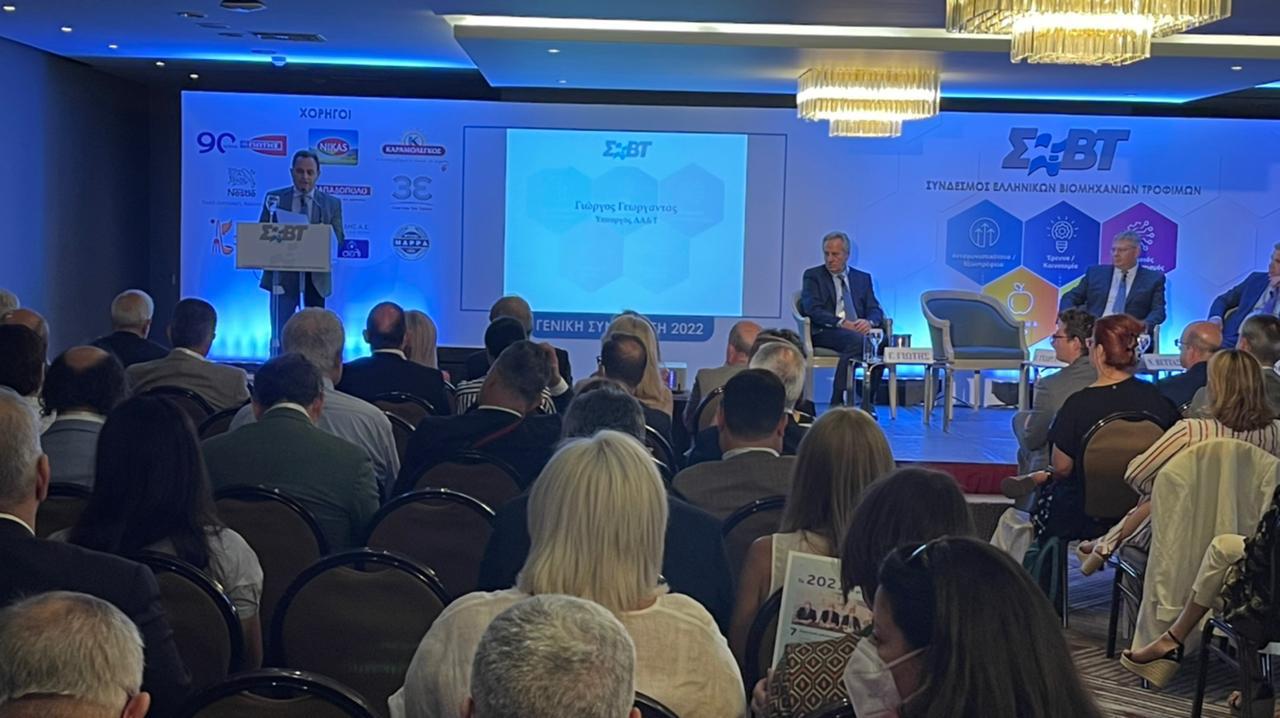 «Ο κλάδος της αγροδιατροφής μπορεί να αποτελέσει το κλειδί για τον μετασχηματισμό του παραγωγικού μοντέλου της χώρας και να προσελκύσει πολλές ξένες επενδύσεις», επισήμανε ο υπουργός Αγροτικής Ανάπτυξης και Τροφίμων, κ. Γιώργος Γεωργαντάς σε χαιρετισμό του στη Γενική Συνέλευση του Συνδέσμου Ελληνικών Βιομηχανιών Τροφίμων και Ποτών.