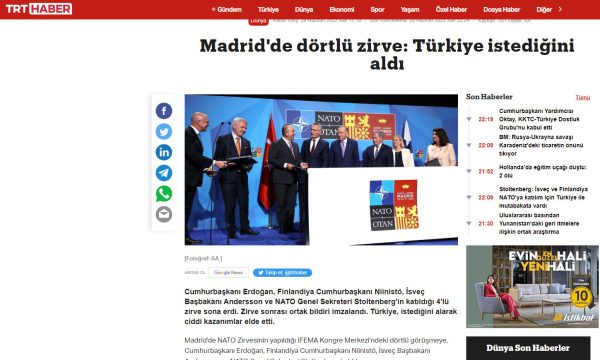 Το TRT απαριθμώντας τα κέρδη του Ερντογάν στην τετραμερή με τον Στόλτενμπεργκ, τον φινλανδό πρόεδρο, Σάουλι Νιινίστο και την σουηδή πρωθυπουργό, Μαγκταλένα Άντερσον σημειώνει: