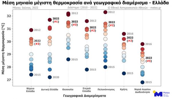 Υψηλές, για την εποχή, τιμές μεγίστων θερμοκρασιών κατέγραψαν 52 μετεωρολογικοί σταθμοί του Εθνικού Αστεροσκοπείου Αθηνών/meteo.gr κατά τον Ιούνιο του 2022. Σε όλα τα γεωγραφικά διαμερίσματα της χώρας καταγράφηκαν θετικές αποκλίσεις θερμοκρασίας, σε σύγκριση με τις μέσες τιμές της περιόδου 2010-2019.