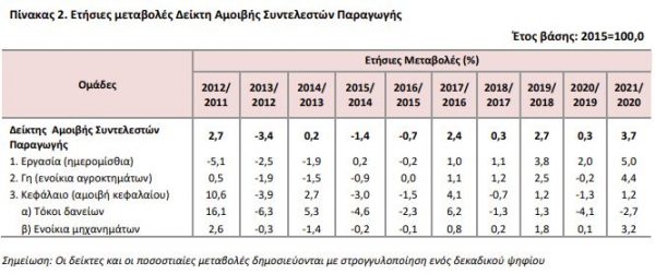 Ειδικότερα, σύμφωνα με τα στοιχεία της ΕΛΣΤΑΤ, ο γενικός δείκτης αμοιβής των συντελεστων παραγωγής σε γεωργία – κτηνοτροφία παρουσιάζει το 2021 αύξηση κατά 3,7% έναντι του 0,3% που καταγράφει ο αντίστοιχος δείκτης του 202ο συγκριτικά με το προηγούμενο έτος.