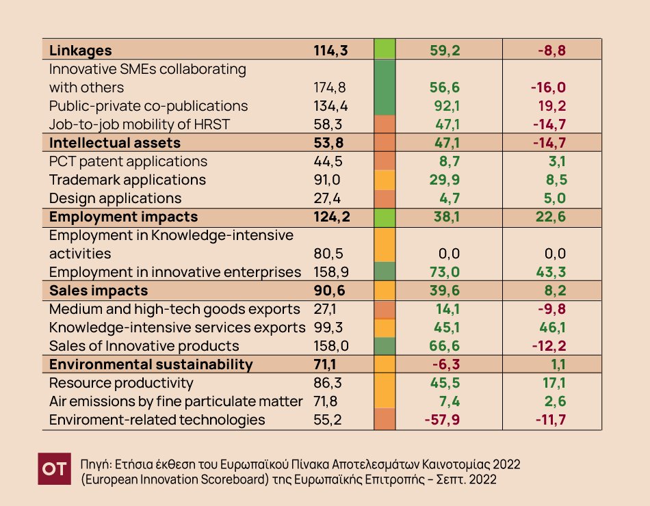 Σύμφωνα με την ετήσια έκθεση του Ευρωπαϊκού Πίνακα Αποτελεσμάτων Καινοτομίας 2022 (European Innovation Scoreboard) της Ευρωπαϊκής Επιτροπής που δημοσιεύτηκε στις 22 Σεπτ. 2022, η Ελλάδα παρουσιάζει σημαντική βελτίωση στον τομέα της καινοτομίας σε ευρωπαϊκό επίπεδο από το 2015.