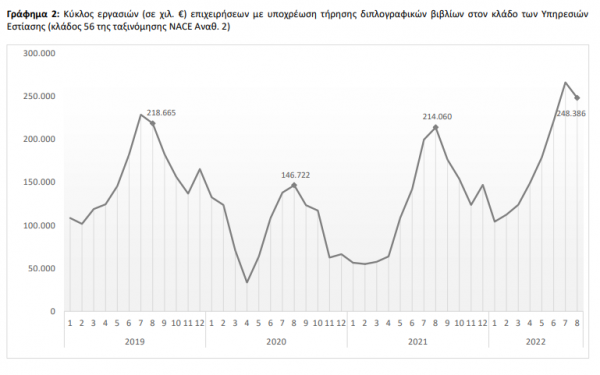 Για τις επιχειρήσεις στον κλάδο των Υπηρεσιών Εστίασης, με υποχρέωση τήρησης διπλογραφικών βιβλίων, για τις οποίες υπάρχουν διαθέσιμα στοιχεία σε μηνιαία βάση, ο κύκλος εργασιών τον Αύγουστο 2022 ανήλθε σε 248.386.359 ευρώ, σημειώνοντας αύξηση 16,0% σε σχέση με τον Αύγουστο 2021, όπου είχε ανέλθει σε 214.060.495 ευρώ.