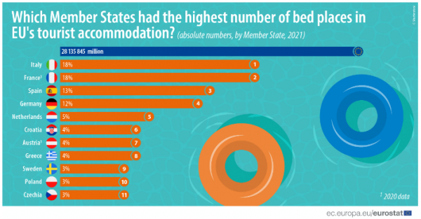 Η Ιταλία είχε το 2021 το 18% του συνόλου των κλινών ή 5,1 εκατ., το ίδιο και η Γαλλία, δηλαδή και στις δύο μαζί αντιστοιχούσε το 36% των τουριστικών κλινών στην ΕΕ. Ακολουθούσαν η Ισπανία (3,8 εκατομμύρια θέσεις κλινών, ποσοστό 13% του συνόλου) και η Γερμανία (3,5 εκατομμύρια, 12%).
