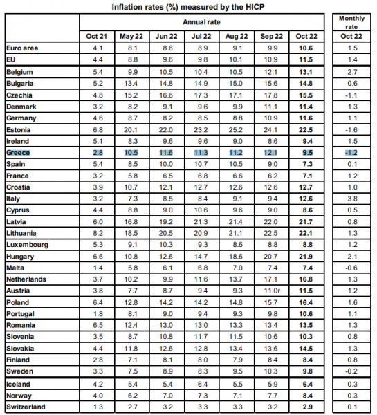 Την ίδια ώρα, σύμφωνα πάντα με τα ίδια στοιχεία, ο ετήσιος πληθωρισμός της Ευρωπαϊκής Ένωσης ανήλθε στο 11,5% τον Οκτώβριο του 2022, από 10,9% τον Σεπτέμβριο. Ενα έτος νωρίτερα, το ποσοστό ήταν 4,4%.
