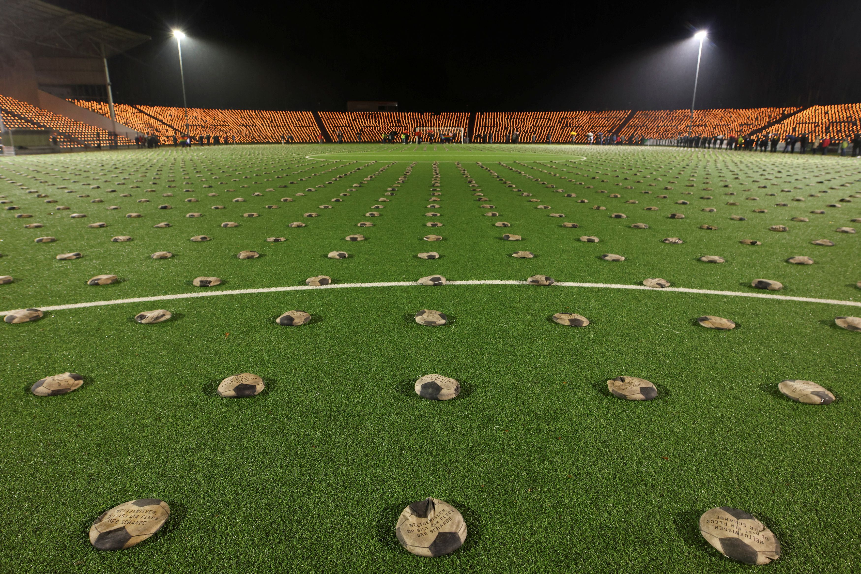 Ξεφούσκωτες μπάλες με άμμο τοποθετήθηκαν σε γήπεδο του Χερν στη Γερμανία στη μνήμη των νεκρών εργατών στο Κατάρ (Reuters)