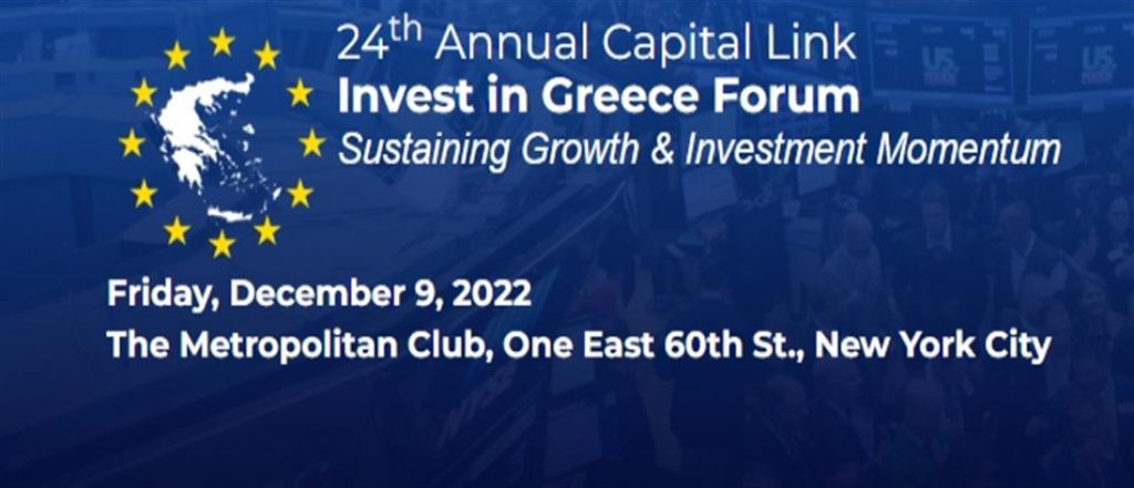 Με τίτλο «Sustaining Growth & Investment Momentum» επιστρέφει για 24η χρονιά το ετήσιο Συνέδριο «Capital Link Invest in Greece Forum». Το συνέδριο θα πραγματοποιηθεί την Παρασκευή, 9 Δεκεμβρίου, 2022 στο «Metropolitan Club» της Νέας Υόρκης σε συνεργασία με το «New York Stock Exchange», το «Athens Stock Exchange» και μεγάλες διεθνείς τράπεζες και οργανισμούς. Όπως κάθε χρόνο, η εκδήλωση τελεί υπό την αιγίδα του Γενικού Προξενείου της Ελλάδος στη Νέα Υόρκη, απολαμβάνοντας την υποστήριξη κορυφαίων χορηγών, στους οποίους συμπεριλαμβάνεται η «JP MORGAN» και η «TEN Ltd (Tsakos Energy Navigation)».