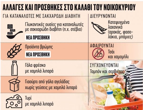 Νέες κατηγορίες προϊόντων που αφορούν στους καταναλωτές ειδικών κατηγοριών (πάσχοντες από σακχαρώδη διαβήτη) προστίθενται από σήμερα Τετάρτη 30 Νοεμβρίου στο «καλάθι του νοικοκυριού», όπως ανακοίνωσε το υπουργείο Ανάπτυξης και Επενδύσεων.