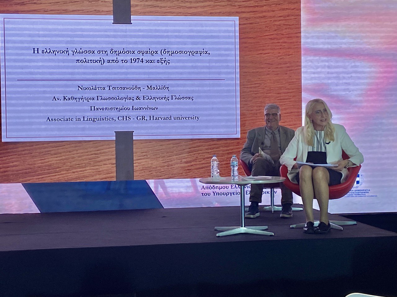 Η Ελληνική γλώσσα στη δημόσια σφαίρα (δημοσιογραφία, πολιτική) από το 1974 και εξής ήταν το θέμα της ομιλίας της αν. Καθηγήτριας Γλωσσολογίας και Ελληνικής Γλώσσας του Πανεπιστημίου Ιωαννίνων κ. Νιικολέττας Τσιτσανούδη – Μαλλίδη.