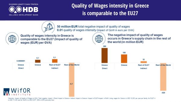 Επιπροσθέτως, στο νέο δείκτη quality of wages – ο οποίος αξιολογεί εάν ο μισθός των εργαζομένων έχει θετικό ή αρνητικό αντίκτυπο στην ποιότητα ζωής τους – με τις υψηλότερες τιμές δεικτών να συνεπάγονται θετικότερη κοινωνική επίδραση, στην Ελλάδα ο αντίκτυπος είναι θετικός, άμεσα και έμμεσα, κατά 440 εκ. ευρώ.