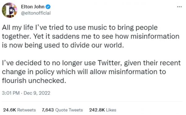 «Σε όλη μου τη ζωή προσπάθησα να χρησιμοποιώ τη μουσική για να φέρω τους ανθρώπους κοντά. Ωστόσο, με λυπεί να βλέπω πώς η παραπληροφόρηση χρησιμοποιείται τώρα για να διχάσει τον κόσμο μας. Αποφάσισα να μην χρησιμοποιώ πλέον το Twitter, δεδομένης της πρόσφατης αλλαγής πολιτικής που θα επιτρέψει στην παραπληροφόρηση να ανθίσει ανεξέλεγκτα», έγραψε ο Έλτον Τζον στους 1,1 εκατομμύρια ακόλουθούς του στο Twitter και είπε «αντίο».