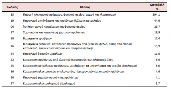 Στην αύξηση του Γενικού Δείκτη Τιμών Εισαγωγών (σύνολο αγοράς) κατά 21,3% συνέβαλαν κυρίως οι μεταβολές των δεικτών των διψήφιων κλάδων της ταξινόμησης NACE Αναθ. 2, ως εξής: