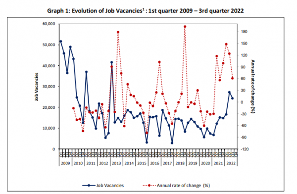 The number of job vacancies in the 3rd quarter 2022 recorded an increase of 60.8% in comparison with the 3rd quarter 2021 (24,324 and 15,125 respectively), while the corresponding number of job vacancies in the 3rd quarter 2021 had recorded an increase of 56.2% in comparison with the 3rd quarter 2020.