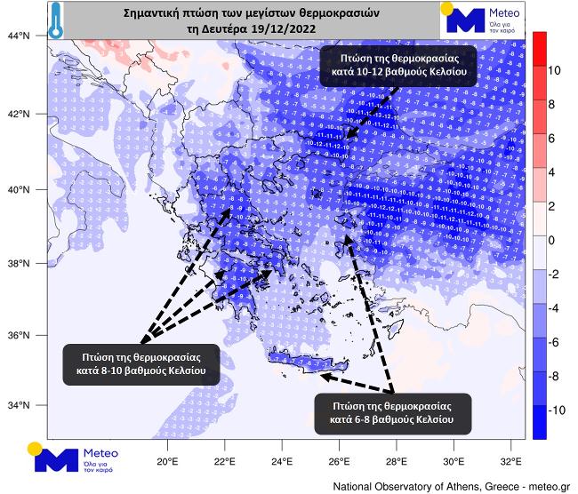 Στον προγνωστικό χάρτη που ακολουθεί αποτυπώνεται η εκτιμώμενη πτώση των μεγίστων θερμοκρασιών τη Δευτέρα 19/12 συγκριτικά με τις μέγιστες τιμές της Κυριακής 18/12.