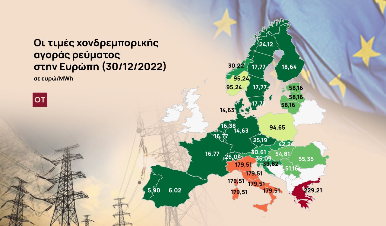 Ειδικότερα, τις τελευταίες μέρες τα κόμματα της αντιπολίτευσης ΣΥΡΙΖΑ και ΠΑΣΟΚ έχουν αναδείξει με επίσημα στοιχεία το γεγονός πως η Ελλάδα είναι ακριβότερη έναντι των υπόλοιπων ευρωπαϊκών κρατών στη χονδρεμπορική αγορά ρεύματος. Και μάλιστα την ώρα που οι τιμές του φυσικού αερίου TTF έχουν βουτήξει στα χαμηλά επίπεδα των 72 – 74 ευρώ ανά Μεγαβατώρα. Πράγματι στις 30 Δεκεμβρίου του 2022 η μέση τιμή της χρηματιστηριακής αγοράς ρεύματος στην Ελλάδα ήταν στα 229,21 ευρώ ανά Μεγαβατώρα, στην Ισπανία μόλις 6,02 ευρώ ανά Μεγαβατώρα, στην Πορτογαλία 5,90 ευρώ, στη Γερμανία 14,63 ευρώ, στην Ιταλία 179,51 ευρώ. Στις 31 Δεκεμβρίου πάλι οι τιμές ανάμεσα σε Ελλάδα και άλλες χώρες είχαν χαοτική διαφορά: Στην Ελλάδα ήταν στα 284,49 ευρώ ανά Μεγαβατώρα, στην Ισπανία μόλις 2,65 ευρώ, ενώ στη Γερμανία η τιμή ήταν αρνητική -0,79 ευρώ ανά Μεγαβατώρα.