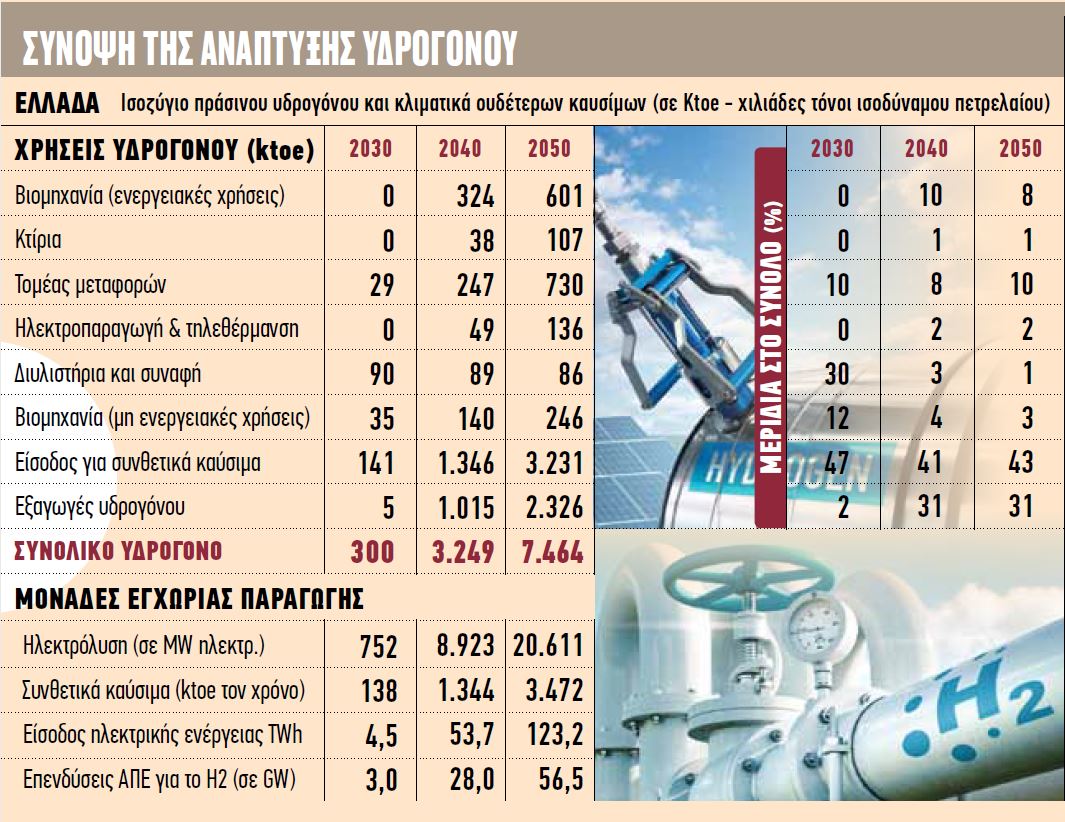 Οι τομείς ανάπτυξης της αγοράς υδρογόνου στην Ελλάδα θα είναι, σε πρώτη φάση, η υποκατάσταση γκρίζου υδρογόνου στα διυλιστήρια και την αμμωνία, καθώς και η τροφοδοσία μεταφορικών μέσων για τα οποία το υδρογόνο παρουσιάζει συγκριτικό πλεονέκτημα, είτε άμεσα είτε μέσω συνθετικών καυσίμων που παράγονται από υδρογόνο. Τα συνθετικά καύσιμα θα τροφοδοτούν αρχικά αεροπορικές και ναυτιλιακές μεταφορές. Οι νέες εφαρμογές των ανανεώσιμων αερίων _ στα πρώτα στάδια βιομεθάνιο από βιοαέριο _ θα είναι κατά προτεραιότητα στην ανάμειξή τους στα δίκτυα αερίου για την τροφοδοσία οικιακών και εμπορικών καταναλωτών, καθώς και στην τροφοδοσία μεταφορικών μέσων. Το παραδοσιακό βιοαέριο θα παραμείνει για εφαρμογές συμπαραγωγής ηλεκτρισμού και θερμότητας ή και για μικρές μονάδες ηλεκτροπαραγωγής.