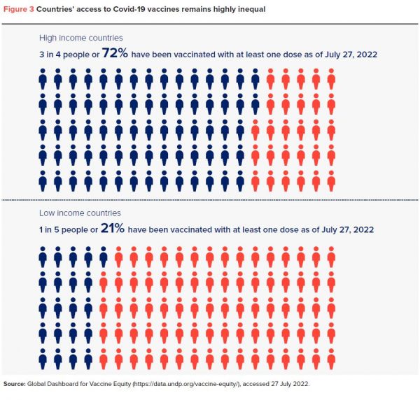 Όπως επισημαίνει, στις χώρες υψηλού εισοδήματος τον Ιούλιο του 2022 το 72% των ανθρώπων είχαν λάβει τουλάχιστον μία δόση εμβολίου Covid-19. Για τις χώρες χαμηλού εισοδήματος, το αντίστοιχο ποσοστό είναι μόλις 21%.