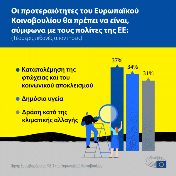 Όσον αφορά δε στα ζητήματα που θα πρέπει να αντιμετωπιστούν κατά προτεραιότητα, οι ευρωπαίοι πολίτες ανέφεραν πρώτα την αντιμετώπιση της φτώχειας και του κοινωνικού αποκλεισμού (37%), τη δημόσια υγεία (34%) και την κλιματική αλλαγή (31%), ενώ οι Έλληνες για άλλη μια φορά έδωσαν ιδιαίτερη βαρύτητα στην υποστήριξη της οικονομίας και τη δημιουργία νέων θέσεων εργασίας (55%), φέρνοντάς τη στη δεύτερη θέση. (Ως πρώτη προτεραιότητα ανέδειξαν την αντιμετώπιση της φτώχειας με 58%, ως τρίτη την ενίσχυση της δημόσιας υγείας με 44% και τέταρτη ήρθε η θωράκιση της δημοκρατίας και του κράτους δικαίου με 33%).